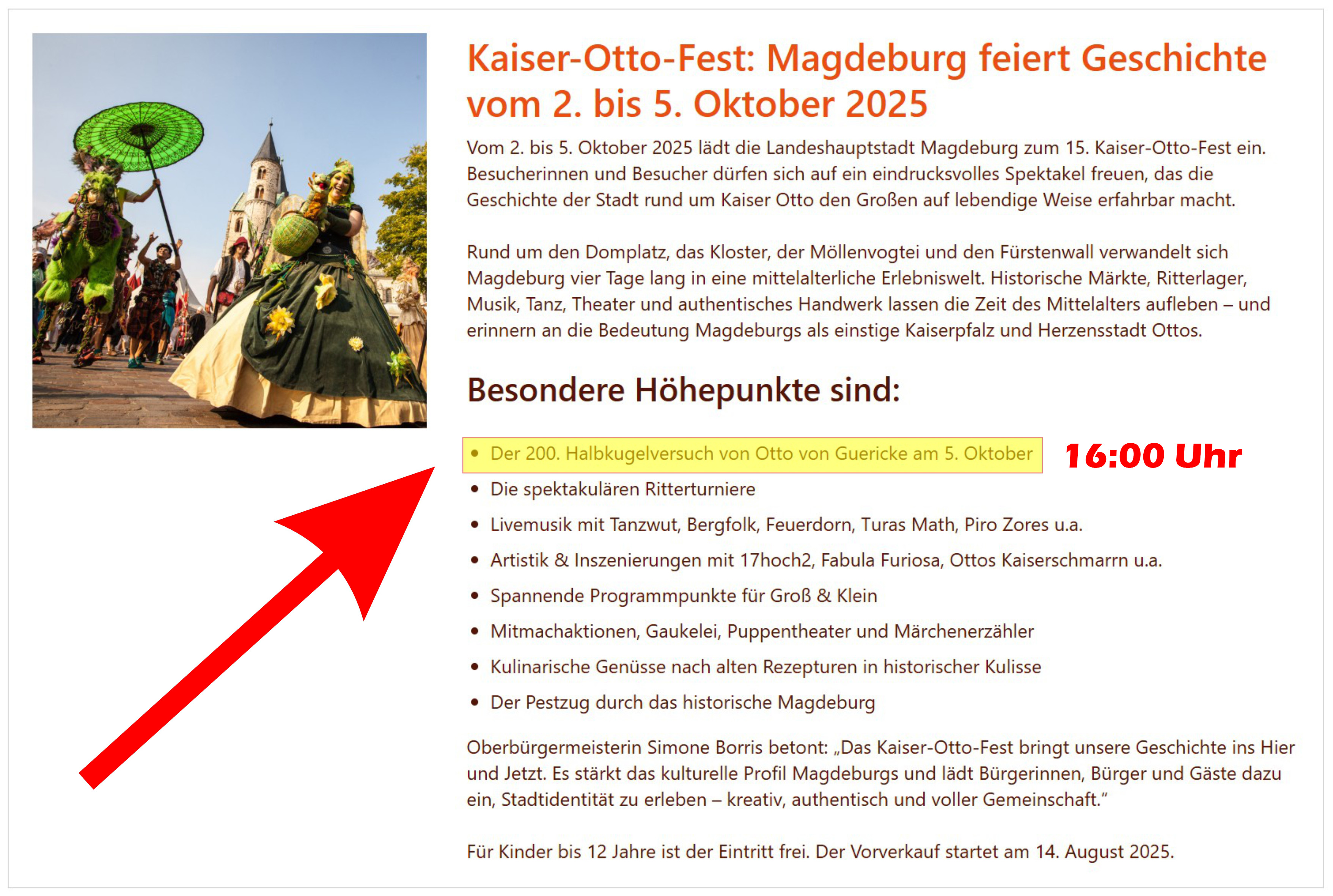 Vom 02.-05.10.2025 feiert Magdeburg das Kaiser-Otto-Fest. Die OvGG wird den 200. Großen Halbkugelversuch am 5.10.2025 gegen 16:00 durchführen.